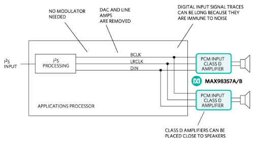 由于其高效率和出色的EMI性能,無濾波器數(shù)字輸入D類放大器已成為消費(fèi)電子設(shè)備中驅(qū)動(dòng)揚(yáng)聲器的公認(rèn)標(biāo)準(zhǔn)。這是因?yàn)樗鼈儾皇芘c模擬對(duì)應(yīng)物相關(guān)的電路板設(shè)計(jì)問題的影響,最具體地說是信號(hào)完整性。單通道數(shù)字D類放大器可以放置在電路板上的遠(yuǎn)程位置,以最大限度地減少大電流電池和揚(yáng)聲器負(fù)載連接的布線。這些放大器不需要模擬輸入D類設(shè)計(jì)所需的DAC和線路驅(qū)動(dòng)器。因此,空間和系統(tǒng)成本下降,設(shè)計(jì)變得更加簡(jiǎn)單。許多D類放大器接受脈沖編碼調(diào)制(PCM)或I類放大器2需要三根導(dǎo)線的 S 數(shù)據(jù):BCLK、LRCLK 和 DIN(圖 2)。PCM 數(shù)據(jù)格式不需要調(diào)制器或應(yīng)用處理器上數(shù)據(jù)的上采樣來提供立體聲數(shù)據(jù)。