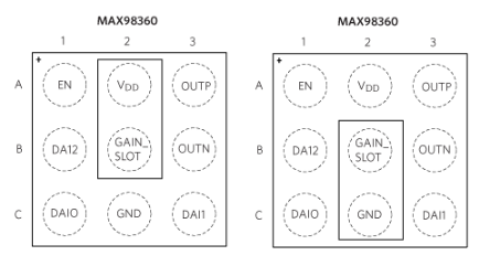 該 IC 還具有其他一些顯著優(yōu)勢(shì),有助于最大限度地減小電路板尺寸/成本。首先,它有1.9毫米的微小尺寸。29 引腳 WLP 具有巧妙的引腳布局,旨在消除對(duì)昂貴電路板過孔的需求。如圖4所示,GAIN_SLOT引腳(位于封裝中心)可以方便地連接到VDD或 GND(直接或使用電阻器)或保持未連接狀態(tài),以提供 I2S/左對(duì)齊增益設(shè)置如表1所示。