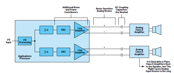 模擬D類放大器一般需要在處理器側使用DAC和線路驅動放大器(圖1),這會增加芯片成本和功耗,并導致揚聲器的輸出噪聲。這種D類放大器還要求良好的電路板布局設計,以避免信號耦合到模擬電路而導致性能下降。