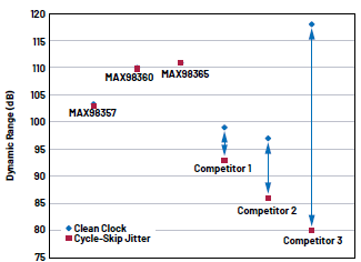 測試結果表明,使用跳周期時鐘時,MAX98357、MAX98360和MAX98365的動態(tài)范圍不會降低。此時,器件的動態(tài)范圍性能比120dB的DAC還高出20dB。Σ-Δ型DAC抖動容差的更多詳細數據可參見參考文章1。