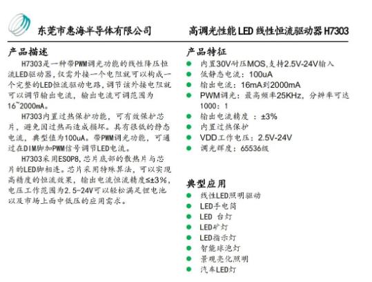惠海半導(dǎo)體推出的DC-DC降壓型線性恒流調(diào)光芯片H7303系列專為高調(diào)光性能、低成本的LED調(diào)光需求設(shè)計。下文為該系列芯片的一個簡單介紹,更多的應(yīng)用資料及產(chǎn)品規(guī)格書請到惠海半導(dǎo)體官網(wǎng)。
