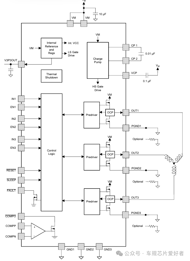 18V、3A三相無刷無感驅(qū)動、180˚正弦,集成驅(qū)動算法+預驅(qū)+MOS |