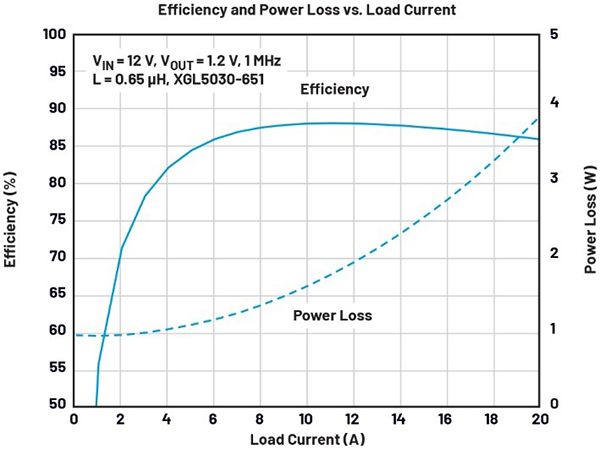 圖3顯示了四相LT7200S解決方案的效率。四相配置與圖1所示配置類似,開關(guān)頻率為1 MHz,電壓從12 V降至1.2 V。它可提供高達(dá)20 A的連續(xù)負(fù)載電流。PHMODE引腳接GND,導(dǎo)致每個(gè)通道發(fā)生90°相移。這種交錯(cuò)操作能夠減少輸入電流紋波,使熱負(fù)荷在整個(gè)電路板上均勻分布,降低對(duì)輸入和輸出電容的要求,盡可能減少EMI,并提高系統(tǒng)整體穩(wěn)定性。為確保在穩(wěn)態(tài)和啟動(dòng)期間更好地均流,應(yīng)將ITH、FB和TRACK/SS連接在一起。