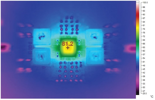 這款器件在12 V輸入下實(shí)現(xiàn)了88%的峰值效率,并在20 A滿負(fù)載電流下保持86%的效率。圖4顯示了LT7200S在12 V降至1.2 V/20 A條件下工作的熱圖像,表明它在四相操作期間實(shí)現(xiàn)了良好的均流。