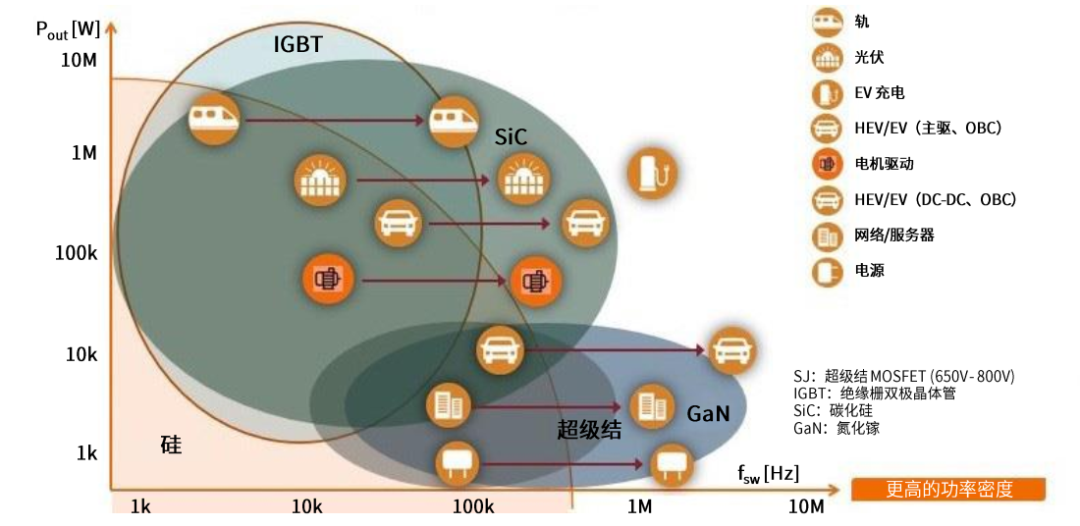 下圖顯示了各種高功率主流應用優(yōu)先考慮使用的開關。紅色箭頭顯示, 許多功率超過 ~10kW 的應用正在從 IGBT 轉向更快的碳化硅 (SiC) 開關。 更快速的開關可帶來更高的功率密度。