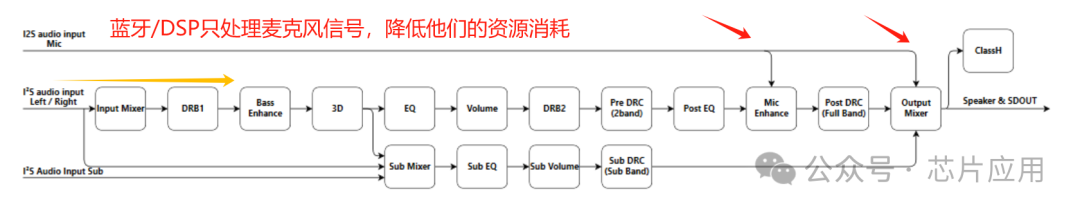 主控/DSP只處理麥克風(fēng)信號,不再處理背景音樂,這樣降低了主控資源的消耗。將背景音樂的調(diào)音交給數(shù)字功放。調(diào)試好的兩路信號在最后端混合,兩路信號之間的調(diào)試互不影響。
