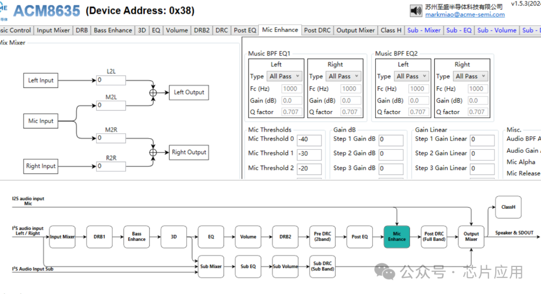 ACM8635是三路BTL輸出架構(gòu),可以輸出30W+2*15W功率,集成升級后的DSP算法,集成麥克風(fēng)輔助處理人聲分離功能,集成動(dòng)態(tài)升壓功能。 |