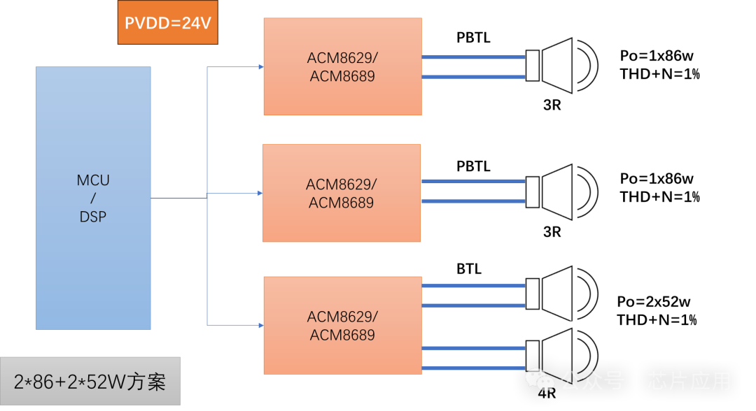 ACM8629/8689 散熱pad朝上加上散熱片輔助能快速散熱,提高功率。8629/8689硬件性能一致,區(qū)別是8689有更豐富的DSP算法,例如兩組DRB,peak DRC技術(shù)等。三顆芯片共用一組I2C和一組I2S,走線(xiàn)簡(jiǎn)潔,功放內(nèi)部分頻,調(diào)試更快捷。