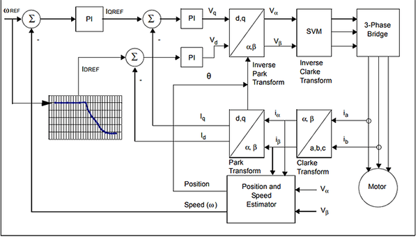 框圖中 Iq 和 Id 的獨立 PI 控制器是 FOC 實現(xiàn)精準(zhǔn)控制的關(guān)鍵: