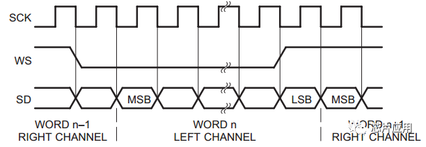 WS也稱幀時(shí)鐘,即LRCLK/Left RightClock。WS頻率等于聲音的采樣率。WS既可以在SCK的上升沿,也可以在SCK的下降沿變化。從設(shè)備在SCK的上升沿采樣WS信號(hào)。數(shù)據(jù)信號(hào)MSB在WS改變后的第二個(gè)時(shí)鐘(SCK)上升沿有效(即延遲一個(gè)SCK),這樣可以讓從設(shè)備有足夠的時(shí)間以存儲(chǔ)當(dāng)前接收的數(shù)據(jù),并準(zhǔn)備好接收下一組數(shù)據(jù)。