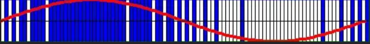 脈沖密度調(diào)制(Pulse Density Modulation, PDM)就是將模擬信號的幅值用固定寬度脈沖的相對密度來表示。具體來說就是高于平均幅值的模擬信號用正脈沖表示,對應(yīng)二進(jìn)制1;低于平均幅值的模擬信號用負(fù)脈沖表示,對應(yīng)二進(jìn)制0。模擬信號的幅值越大,對應(yīng)數(shù)字信號1的密度就越大;反之,模擬信號的幅值越小,對應(yīng)數(shù)字信號0的密度就越大。中間幅值則用1和0連續(xù)轉(zhuǎn)換來表示。下圖是紅色模擬信號與藍(lán)色PDM信號對比圖,其中1用藍(lán)色表示,0用白色表示。