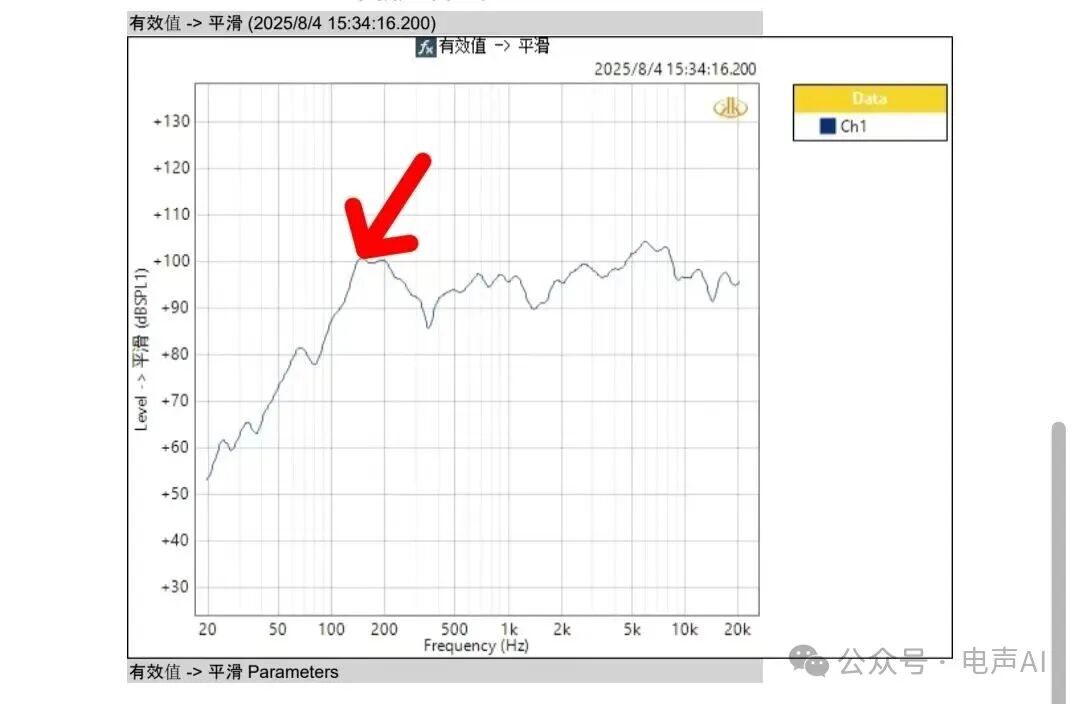 那就是頻響曲線是低頻段明顯的峰值點(diǎn),這個點(diǎn)基本就是F0。以下這個揚(yáng)聲器的F0是150Hz.與實(shí)際測試一致呢。