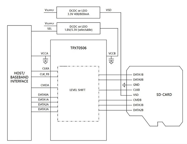 針對SD3.0規(guī)范下的高速傳輸需求,TPXT0506提供了低至數(shù)納秒的傳播延遲,并專門設(shè)計(jì)了時鐘反饋通道,以補(bǔ)償電平轉(zhuǎn)換和PCB走線引入的延遲,為SDR104等超高速模式下的數(shù)據(jù)讀取提供了充足的時序裕量,確保數(shù)據(jù)傳輸?shù)姆(wěn)定與準(zhǔn)確。