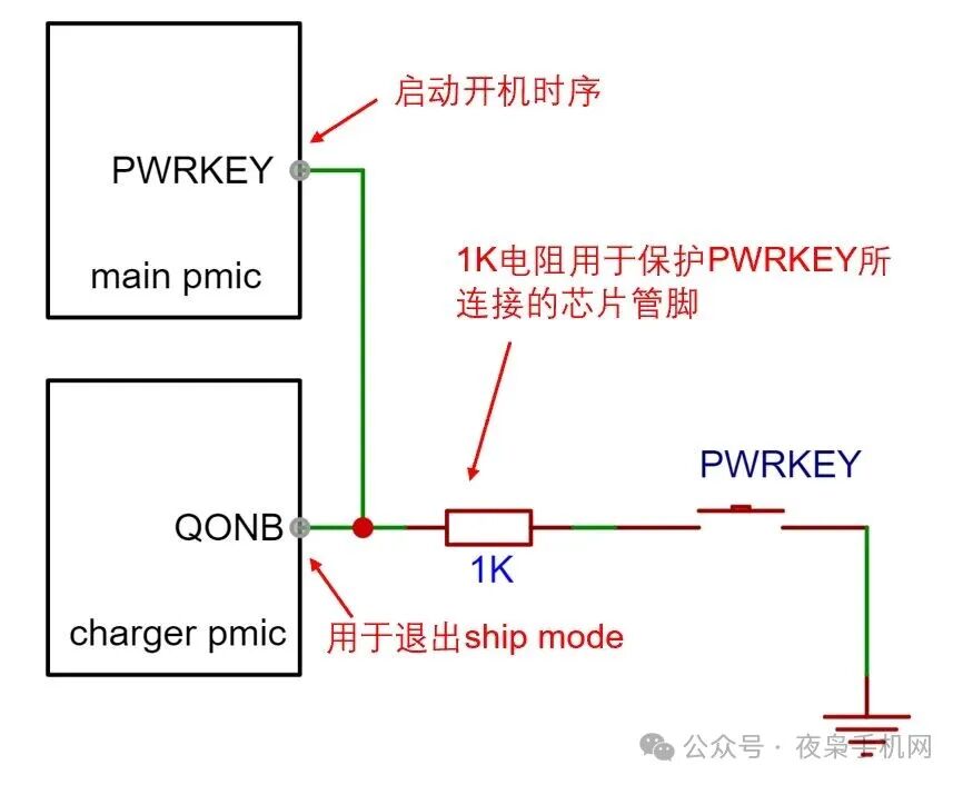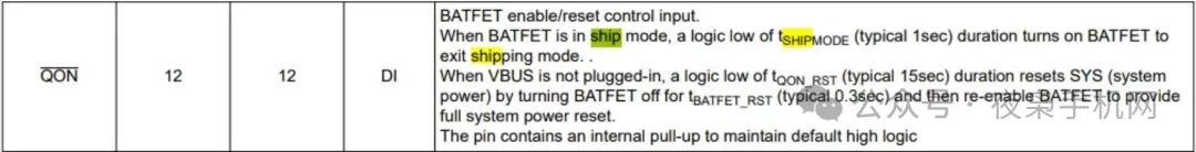 buck charger IC有個(gè)QON引腳,用于控制運(yùn)輸模式的退出,在手機(jī)電路上通常連接到開機(jī)鍵。這樣用戶第一次開機(jī)的動(dòng)作就讓手機(jī)退出運(yùn)輸模式了。此外,除了按開機(jī)鍵,我們插入充電器,也可以自動(dòng)退出Ship Mode。