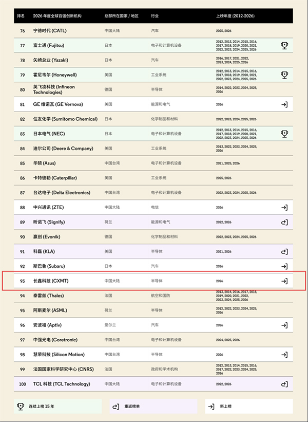 據(jù)全球知識產(chǎn)權與科技信息分析權威機構(gòu)科睿唯安(Clarivate)發(fā)布的2026年度“全球百強創(chuàng)新機構(gòu)(Top 100 Global Innovators 2026)”榜單,中國存儲芯片龍頭企業(yè)長鑫科技憑借在DRAM領域的領先研發(fā)能力與扎實專利儲備首次躋身“全球百強創(chuàng)新機構(gòu)”榜單,也是此次上榜的7家中國大陸企業(yè)中,唯一一家半導體存儲企業(yè)。
