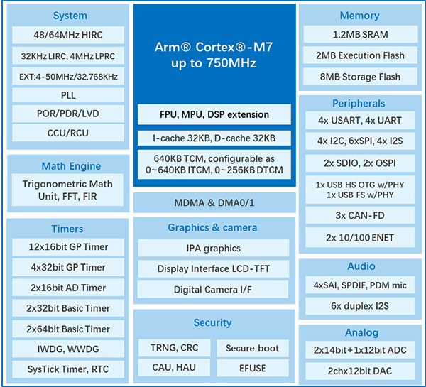 GD32H78E/77E、GD32H789/779系列MCU均基于性能強悍的Cortex®-M7內(nèi)核,主頻高達750MHz。該系列芯片擁有超高存儲配置,最高可支持2MB Execution Flash與8MB Storage Flash,并搭載1.2MB的SRAM,更特別配備高達640KB大容量緊耦合內(nèi)存(TCM),實現(xiàn)CPU同頻運行,指令與數(shù)據(jù)的零等待執(zhí)行。無論是高實時任務、復雜算法還是密集型數(shù)據(jù)處理,這一革新架構可讓算力持續(xù)釋放,系統(tǒng)響應更快、執(zhí)行更穩(wěn)。