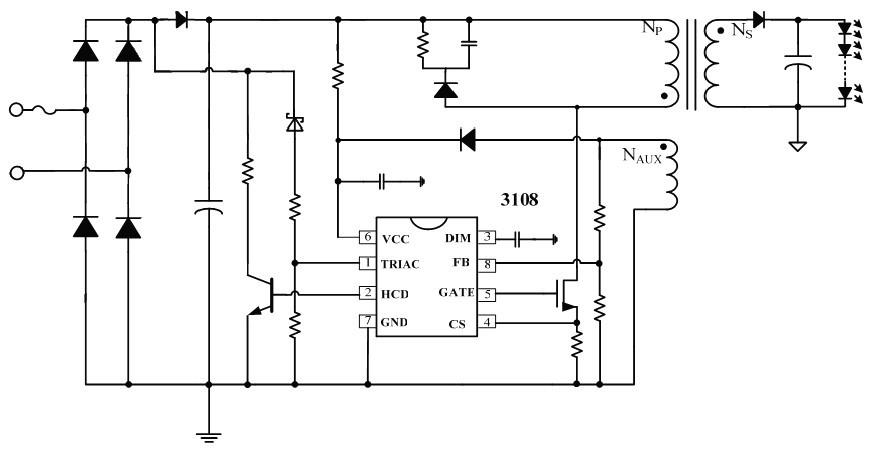 HC3108是一款支持可控硅調(diào)光器的LED恒流控制芯片。適用于輸入全電壓范圍的反激式隔離LED恒流電源。HC3108工作在電感電流斷續(xù)模式,采用原邊反饋模式,無需次級(jí)反饋電路,也無需補(bǔ)償電路即可實(shí)現(xiàn)恒流,極大的節(jié)約系統(tǒng)成本和體積。芯片采用了專利的恒流控制方式,可以達(dá)到優(yōu)異的線性調(diào)整率和負(fù)載調(diào)整率。HC3108芯片內(nèi)部集成了可控硅調(diào)光控制電路,外圍僅需要很少的組件就可與芯片配合實(shí)現(xiàn)調(diào)光功能。調(diào)光范圍寬,無閃爍。HC3108芯片內(nèi)帶有高精度的電流取樣電路,使得LED輸出電流精度達(dá)到±3%以內(nèi)。HC3108具有多重保護(hù)功能,包括LED開路保護(hù)LED短路保護(hù)、芯片過溫保護(hù),過壓保護(hù),欠壓保護(hù), FB短路保護(hù)等。HC3108采用SOP-8封裝。管教完全兼容BP3108