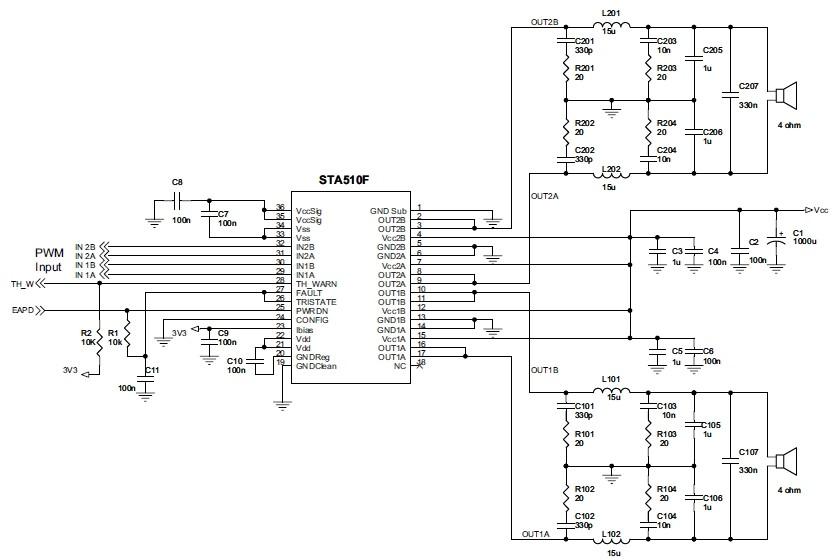 STA510F是為配合ST其它系列的采用ST獨(dú)有的FFX(全靈活放大)數(shù)字調(diào)制技術(shù)的產(chǎn)品而專門設(shè)計(jì)的,但是也支持其它品牌的采用任何一種PWM調(diào)制方案(如三值增量、相移或二值增量調(diào)制技術(shù))的驅(qū)動(dòng)器。這款功放芯片確保全部PWM輸入信號(hào)的音質(zhì),同時(shí)還為家庭影院系統(tǒng)、微型組合音響系統(tǒng)等要求嚴(yán)格且注重成本的產(chǎn)品提供了一個(gè)成本效益非常高的功率輸出級解決方案。