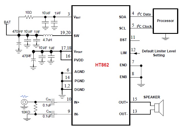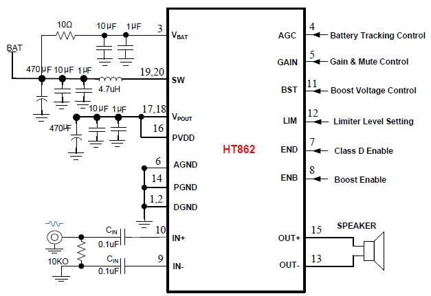 HT862(內(nèi)置自適應同步升壓/AGC/限溫功能8W單聲道智能音頻功率放大器) |