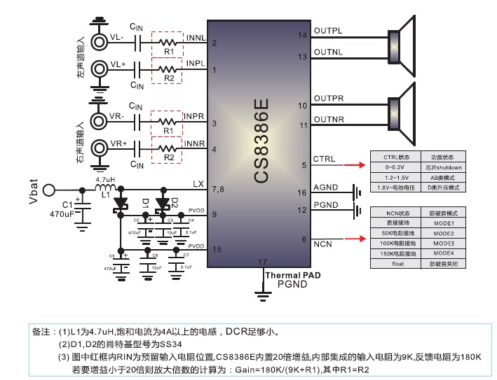 擴(kuò)頻模式,靜音功能,三種防破音模式,AB/D切換,內(nèi)置升壓,18W單聲道音頻功放 |