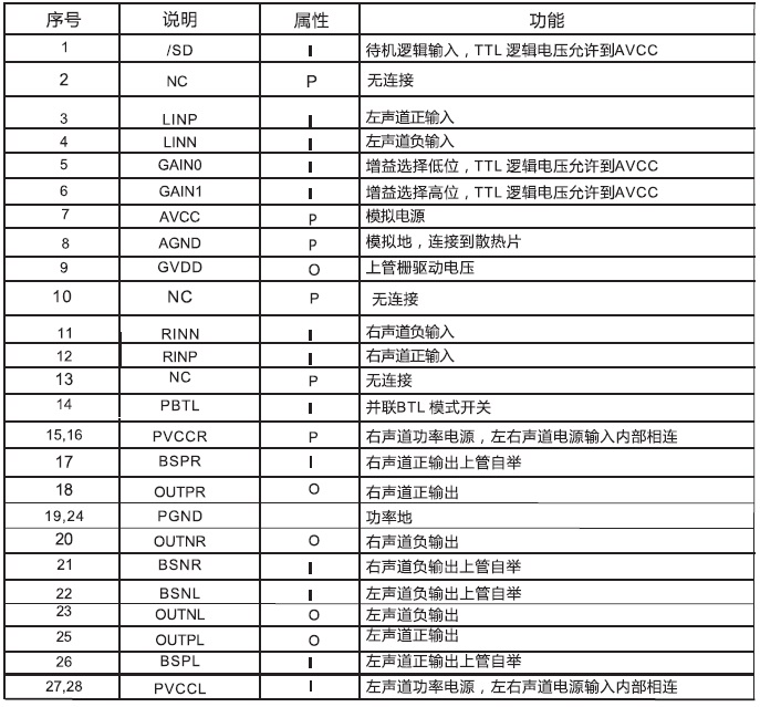 42W立體聲/75W單聲道D類功放IC,,工作電壓5-26V,極限耐壓32V! |