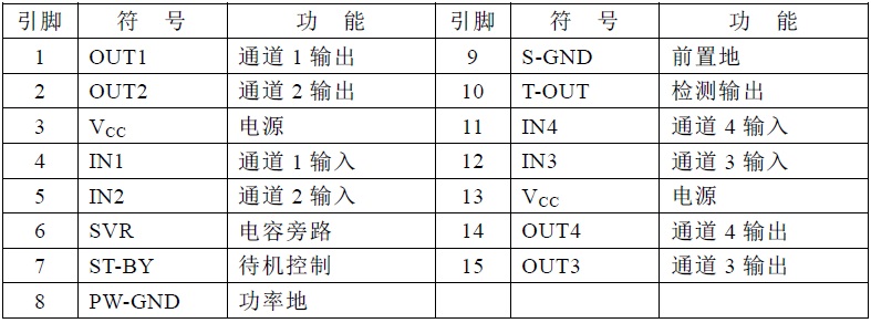 4×13W(每通道,VCC=15V,f=1kHz,THD=10%,RL=2Ω)