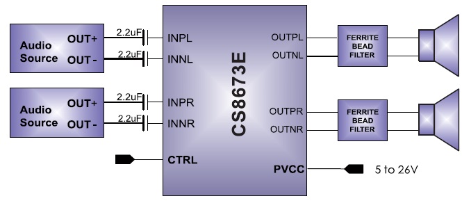 CS8673(具備擴(kuò)頻功能、低空載電流、免電感、2X40W立體聲、80W單聲道D類音頻功放IC) |