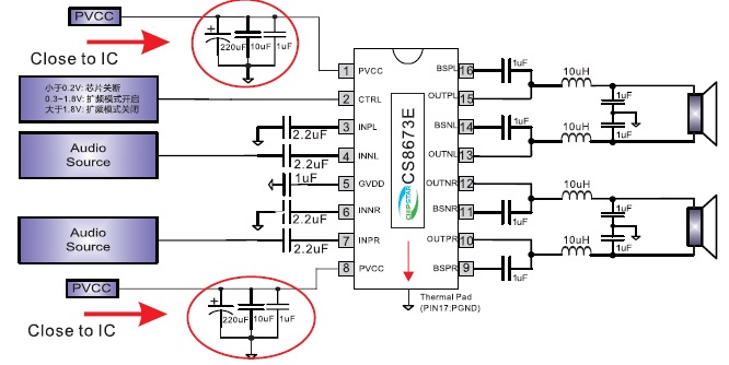 CS8673E內(nèi)置了過流保護(hù),短路保護(hù)和過熱保護(hù),有效的保護(hù)芯片在異常的工作條件下不被損壞。CS8673E可以驅(qū)動低至4Ω負(fù)載的揚(yáng)聲器 ,最高可提供80W的連續(xù)功率;CS8673E具有高達(dá)92%的效率,使得在播放音樂的時候不需額外的散熱器。