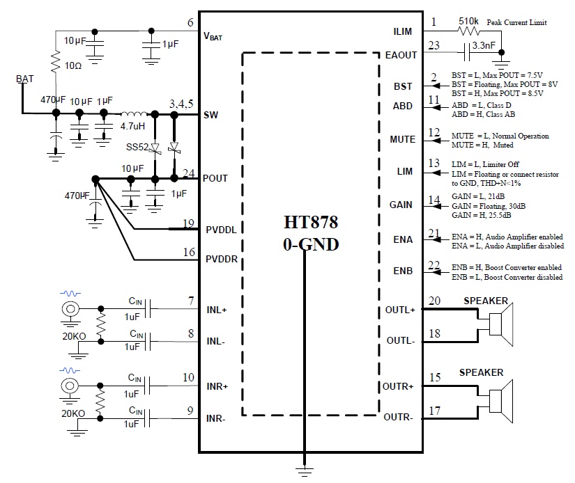 當(dāng)前位置:首頁->產(chǎn)品展示->功放IC->HT878/HT878T(可任意限幅、單節(jié)鋰電池內(nèi)置自適應(yīng)升壓8W雙聲道音頻功放IC) |