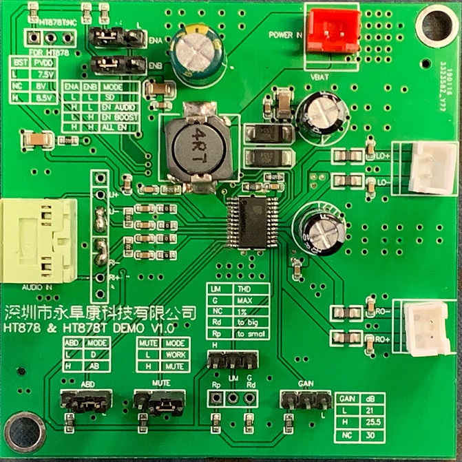 此外,HT878內(nèi)部集成免濾波器調(diào)制技術(shù),能夠直接驅(qū)動(dòng)揚(yáng)聲器,內(nèi)置的關(guān)斷功能使待機(jī)電流最小化,還集成了輸出端過流保護(hù)、片內(nèi)過溫保護(hù)和電源欠壓異常保護(hù)等功能。