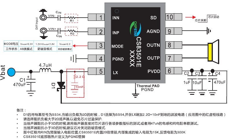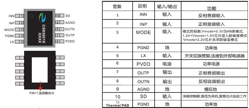 擴(kuò)頻模式,靜音功能,三種防破音模式,AB/D切換,內(nèi)置升壓,18W單聲道音頻功放 |