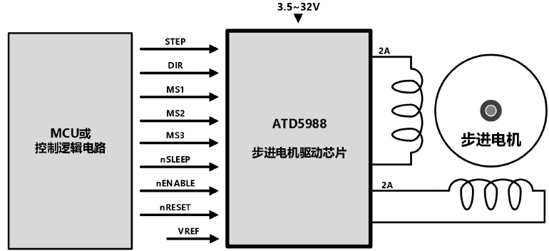 ATD5988是一種便于使用的內(nèi)部集成了譯碼器的微特步進(jìn)電機(jī)驅(qū)動(dòng)器。其設(shè)計(jì)為能使雙極步進(jìn)電機(jī)以全、半、1/4、1/8、1/16、1/32步進(jìn)模式工作。步進(jìn)模式由邏輯輸入管腳MSx選擇。輸出驅(qū)動(dòng)能力達(dá)到32V和±2A。