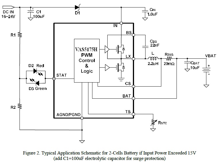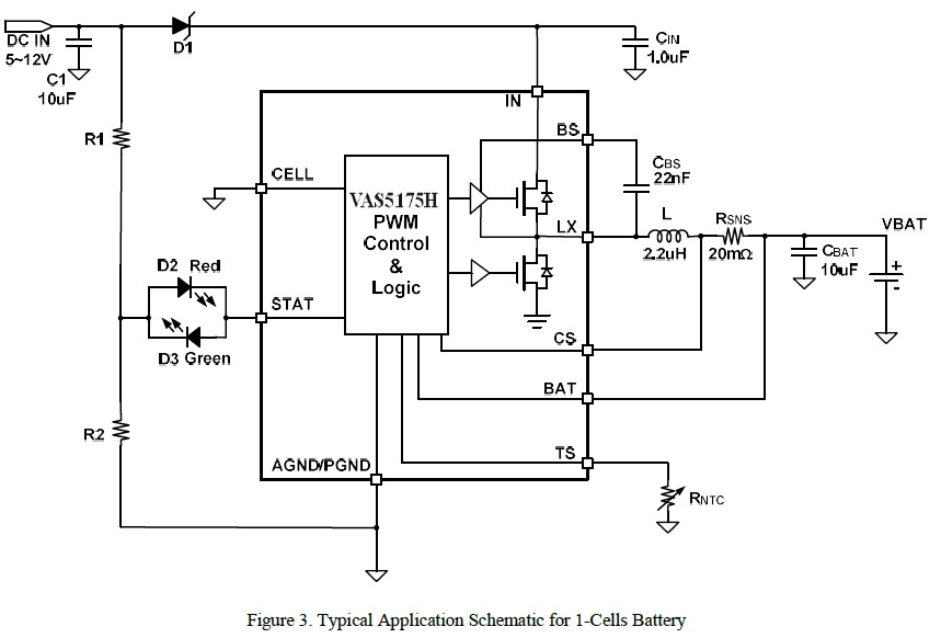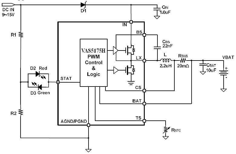 VAS5175H 是一款5V-24V 輸入,開(kāi)關(guān)降壓型1節(jié)4.35V/2節(jié)8.7V鋰離子/聚合物電池充電芯片, 以高精度調(diào)節(jié)2A 充電電流,和電池電壓。它密切監(jiān)測(cè)電池組的溫度只在設(shè)置安全溫度范圍下允許充電,還提供電池檢測(cè)、預(yù)充電調(diào)節(jié)、充電飽充和充電狀態(tài)指示等功能。 |