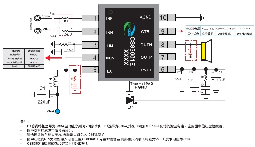 CS83601(內(nèi)置BOOST升壓模塊、單節(jié)鋰電恒定11W功率單聲道AB/D類切換音頻功放IC) |