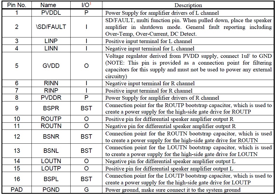 擴頻功能、低空載電流、40倍增益、免濾波、2X23W/33W(PBTL) D類音頻放大器 |