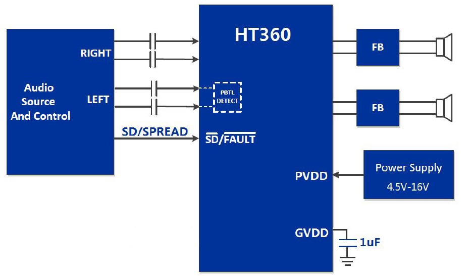 HT360 是一款高效D 類音頻功率放大器。在14.5V供電的立體聲(BTL)模式下,能夠持續(xù)提供2*20W/4Ω功率輸出;在單聲道(PBTL)模式下,能夠持續(xù)提供30W/4Ω功率輸出。