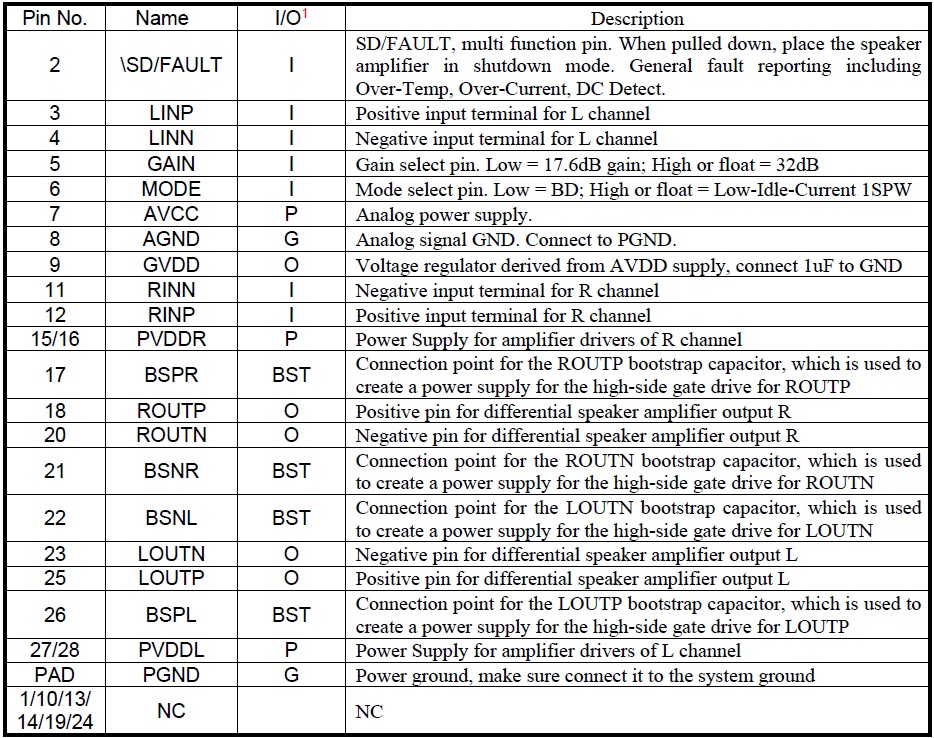 擴頻功能、低空載電流、40倍增益、免濾波、2X23W/33W(PBTL) D類音頻放大器 |