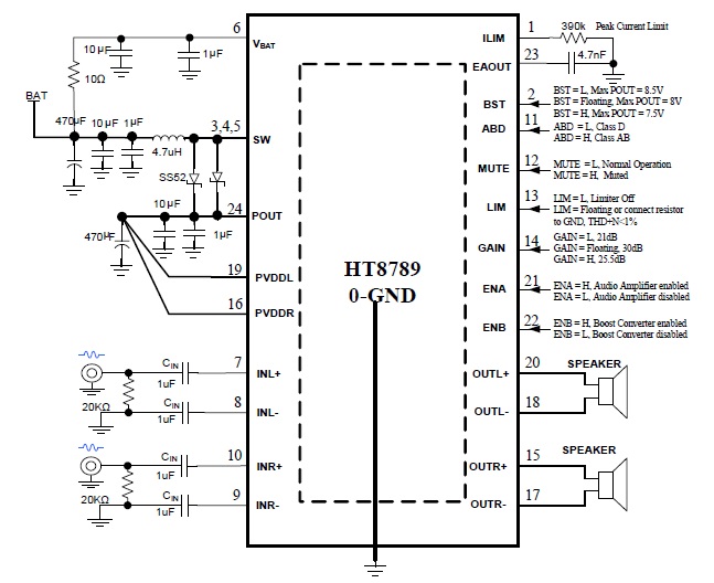 HT8789是一款內(nèi)置自適應(yīng)H類多段升壓的立體聲D類音頻功率放大器,由鋰電池供電升壓至VPOUT=8.5V時, THD+N=1%、1kHz信號條件下,能連續(xù)輸出2×7W功率(4Ω負載)。