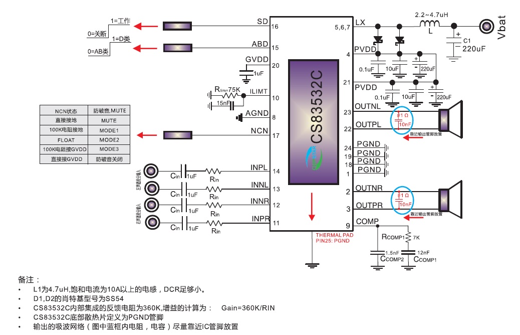 擴頻模式,靜音功能,三種防破音模式,AB/D切換,內(nèi)置升壓,18W單聲道音頻功放 |