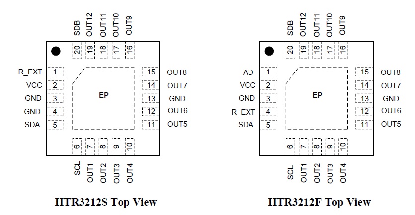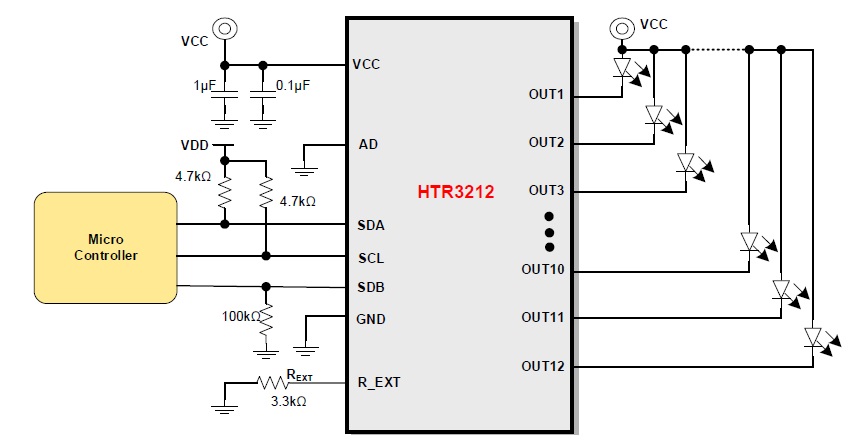 HTR3236是一款36路LED PWM驅動器,PWM頻率可固定為3kHz或22kHz。每一路最大輸出電流可通過外置電阻REXT調節(jié),最大38mA,并
