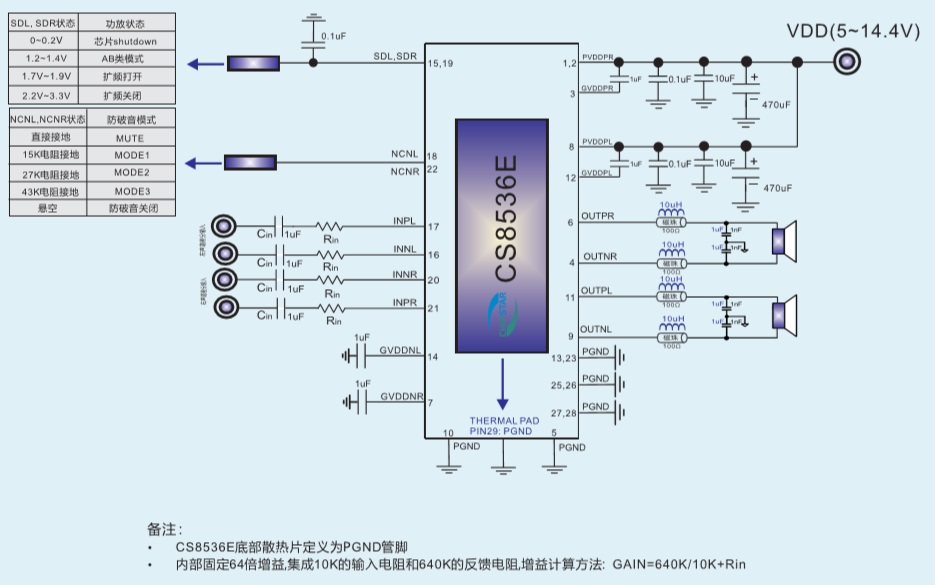 CS8536E的全差分架構(gòu)和極高的PSRR有效地提高對RF噪聲的仰制能力.CS8536E采用專有的AERC((Adaptive Edge Rate Control)技術(shù),在音頻全帶寬范圍內(nèi)極大地降低了EMI的干擾,對60cm的音頻線,在FCC的標(biāo)準(zhǔn)下具有超過20dB的裕量,另外CS8536E內(nèi)置了過流保護(hù),短路保護(hù)和過熱保護(hù),有效的保護(hù)芯片在異常的工作條件下不被損壞。