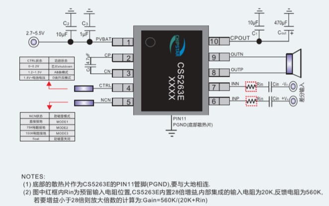 CS5263E提供了ESOP10的封裝類型,其額定的工作溫度范圍為-40℃至85℃。