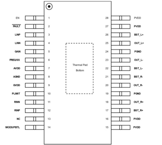 - THD+N ≤ 0.02% 測試條件 1W, 1kHz,4Ω, PVDD = 24V