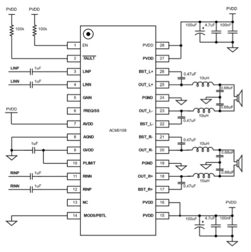ACM3108 工作電壓范圍在4.5-16V,輸出配置可以立體聲BTL,也可以單通道PBTL。