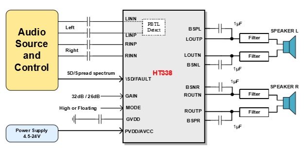 HT338是一款高效D類音頻功率放大器。 在24V供電的立體聲(BTL)模式、THD+N=10% 條件下,能夠持續(xù)提供2*40W/6Ω功率輸出;在 單聲道(PBTL)、模式、THD+N=10%條件下, 能夠持續(xù)提供100W/3Ω功率輸出。