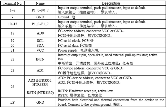 HTR3335 HTR3335是一款I(lǐng)2C SMBus IO 擴展器 , 2.2V~5.5V電源供電。16個IO端口中的任何一個都可以單獨配置為輸入或輸出。此外,任一IO可驅(qū)動LED QFN4×4-24L 2.2V-5.5V 具有中斷功能的16位I2C和SMBus IO擴展器 TCA9535