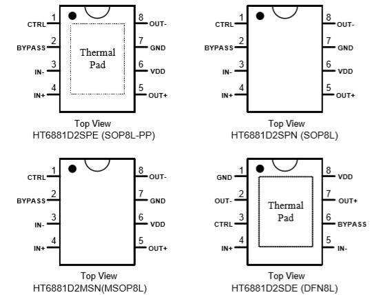 HT6881內(nèi)部集成免濾波器數(shù)字調(diào)制技術(shù),能夠直接驅(qū)動(dòng)揚(yáng)聲器,并最大程度減小脈沖輸出信號(hào)的失真和噪音。輸出無需濾波網(wǎng)絡(luò),極少的外部元器件節(jié)省了系統(tǒng)空間和成本,是便攜式應(yīng)用的理想選擇。 此外,HT6881內(nèi)置的關(guān)斷功能使待機(jī)電流最小化,還集成了輸出端過流保護(hù)、片內(nèi)過溫保護(hù)和電源欠壓異常保護(hù)等功能。