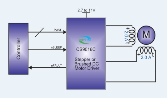 CS9016C為玩具、打印機(jī)和其它電機(jī)一體化應(yīng)用提供一種雙通道電機(jī)驅(qū)動方案。CS9016C有兩路H橋驅(qū)動,可以驅(qū)動兩路刷式直流電機(jī),一個雙極步進(jìn)電機(jī),多個螺線管或者其它感性負(fù)載。每個H橋的功率輸出模塊由N溝道功率MOSFET組成,用于驅(qū)動電機(jī)繞組。每個H 橋均具備調(diào)節(jié)或限制繞組電流的電路。該器件利用故障輸出引腳實現(xiàn)內(nèi)部關(guān)斷功能,提供過流保護(hù)、短路保護(hù)、欠壓鎖定和過熱保護(hù),并提供了一種低功耗休眠模式。另外提供一個錯 誤輸出管腳nFAULT,當(dāng)過流過溫保護(hù)的時候,nFAULT為低電平.