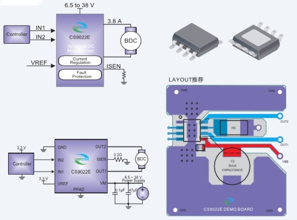 IU9019為玩具、打印機(jī)和其它電機(jī)一體化應(yīng)用提供一種雙通道電機(jī)驅(qū)動(dòng)方案。CS9016C有兩路H橋驅(qū)動(dòng),可以驅(qū)動(dòng)兩路刷式直流電機(jī),一個(gè)雙極步進(jìn)電機(jī),多個(gè)螺線管或者其它感性負(fù)載。