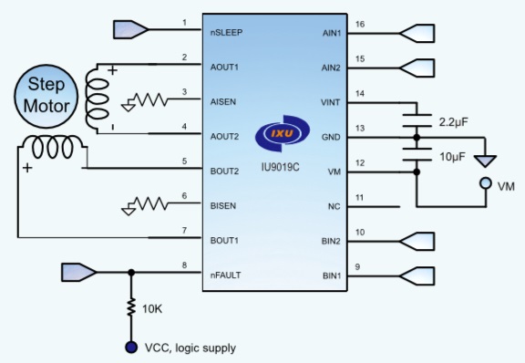 IU9019C為玩具、打印機和其它電機一體化應用提供一種雙通道電機驅動方案。IU9019C有兩路H橋驅動,可以驅動兩路刷式直流電機,一個雙極步進電機,多個螺線管或者其它感性負載。每個H橋的功率輸出模塊由N溝道功率MOSFET組成,用于驅動電機繞組。每個H 橋均具備調節(jié)或限制繞組電流的電路。該器件利用故障輸出引腳實現(xiàn)內部關斷功能,提供過流保護、短路保護、欠壓鎖定和過熱保護,并提供了一種低功耗休眠模式。另外提供一個錯 誤輸出管腳nFAULT,當過流過溫保護的時候,nFAULT為低電平.